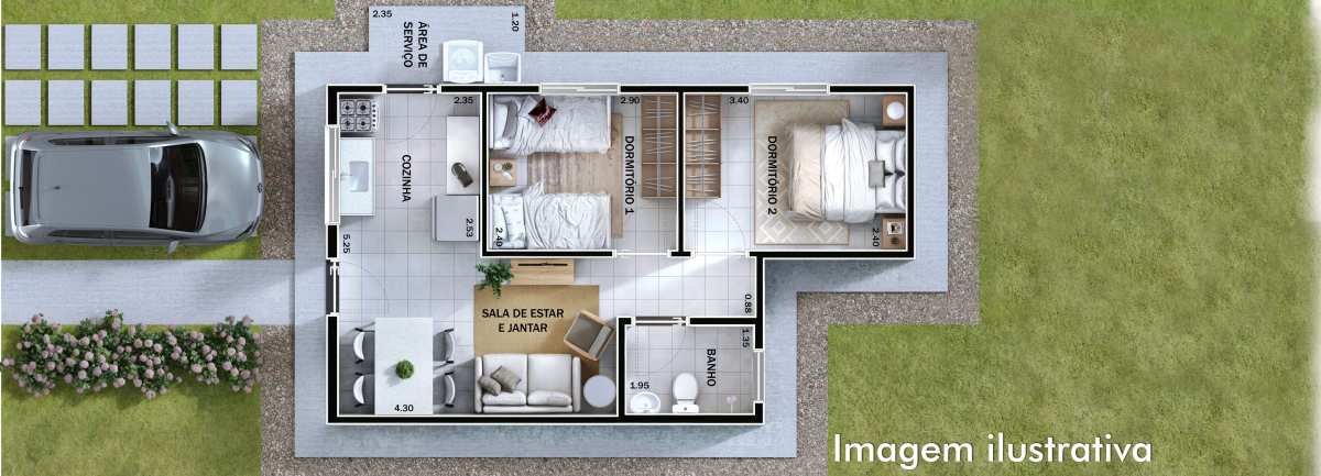 O imóvel tem 2 quartos, possui 1 banheiro, 1 sala e 2 vagas de garagem.